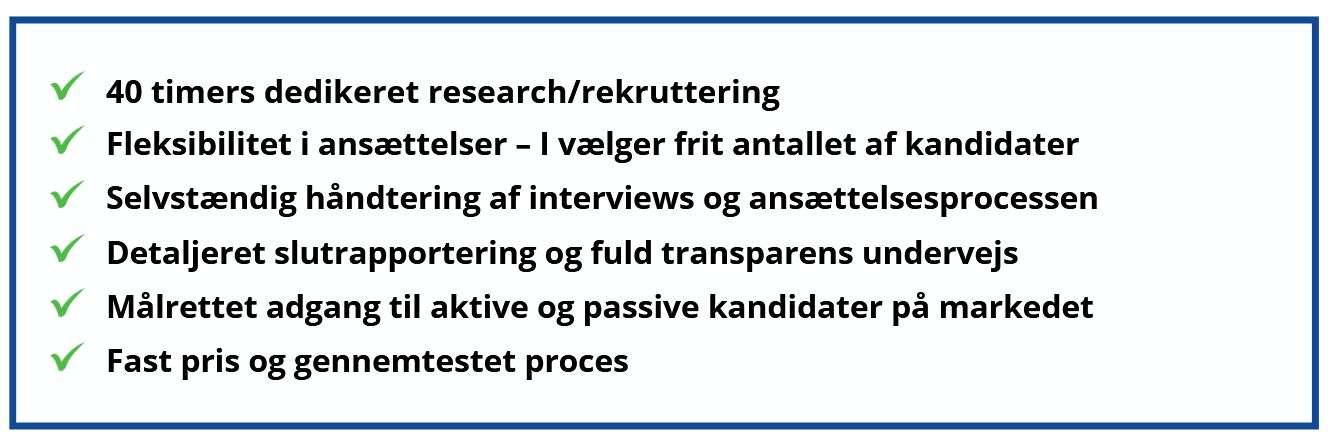 Løsningen med 40 timer giver jer målrettet research og rekruttering. En skræddersyet løsning til at dække jeres behov for hjælp til at udarbejde vigtige kandidatmaterialer, skabe en longlist/shortlist eller håndtere en komplet rekrutteringsproces, der identificerer og tiltrækker de mest relevante kandidater på markedet. Med denne fleksible model får I mulighed for at ansætte det antal kandidater, I har behov for, med fuld gennemsigtighed og detaljeret afrapportering gennem hele processen. Alle processer afsluttes med en detaljeret slutrapport med data og kandidat indsigter fra markedet.